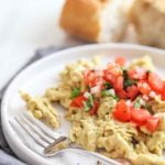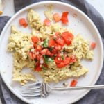 Heat the oil over medium heat. Pour in the egg mixture; cook and stir until eggs are thickened, and no liquid egg remains. Serve with fresh chopped tomatoes