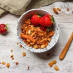 Place into the oven and bake for around 2 hours. Give the granola a mix every 20 mins and rotate the trays after 60 mins of baking.