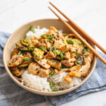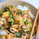 Remove from the heat, add in the chicken, and stir until well coated. Garnish with sesame seeds and scallions if desired.