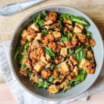 Put the pumpkin on a baking tray lined with paper. Bake in the oven for about 20 minutes, halfway through cooking time add the walnuts and drained tofu.