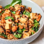 Add the cooked bulgar to the roasted pumpkin on the baking tray and mix, collecting the whole flavour from the roasted pumpkin. Add the spinach and mix well.