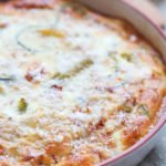 5. Arrange the veggies into the prepared pan and top with the chicken slices. Then, pour the egg mixture on top and sprinkle with grated parmesan cheese.