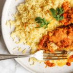 8. Serve 2 chicken thighs along with sauce and a serving of saffron rice.