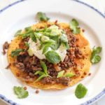 To serve, place 2 pancakes on a plate top with the minced meat mixture, a tbsp. of Greek yoghurt and the chopped fresh herbs and some spring onion.