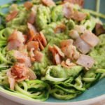7. Mix the avocado puree and bacon through the zoodles (zucchini noodles), divide onto four plates and sprinkle with the rest of the Parmesan to serve.