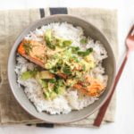 6. Gently mix. To assemble the rice bowls, divide rice among two bowls, top it off with a salmon fillet, and top each bowl with half the avocado mixture