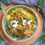 6. To serve, divide the rice equally into bowls, adding a portion of the sautéed tofu and vegetables. Garnish with chopped mint, cilantro and toasted coconut flakes.