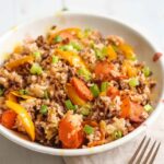 2. Add the carrots, peppers and white parts of the spring onions. Sauté for 10 minutes until the vegetables start to soften.
