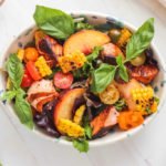 5. Divide the salad leaves between two bowls topped with the sliced peach, tomatoes and grilled corn.