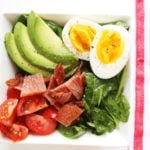 Divide the spinach between two bowls, top with halved eggs, chopped bacon, tomatoes, and avocado. Season with salt and pepper before serving.