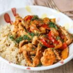 In a wok or large pan heat 1 tbsp. of coconut oil, and stir fry the vegetables (peppers, onions, chilli pepper, garlic and ginger) over high heat for about 3 minutes. Add the mango and mix, cooking for another 2 minutes, then remove everything and set aside.