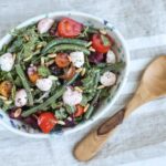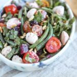 Combine green beans with tomatoes, beets, onion, cranberries, mozzarella and pine nuts. To serve, drizzle with the dressing and season with more salt and pepper to taste.
