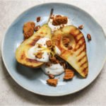Spread the grilled half pears over the plates, top with a spoonful of yogurt, sprinkle with the pecan nuts and decorate with a few pieces of biscuit.