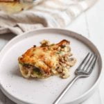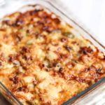 Next, add in the pork and veg mixture to the baking dish. Top with the remaining cheese, cover with foil, and covered for 30 minutes and uncovered for another 30 minutes.