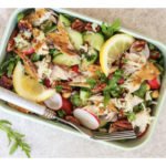 Break the mackerel into pieces and place on top of the salad. Sprinkle with pecans and serve with additional lemon slices.