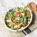 Once cooked add the roasted vegetables and rocket to a large bowl and drizzle with the remaining 1 tbsp. of olive oil.