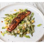 Salmon teriyaki with green beans and sweetcorn rice