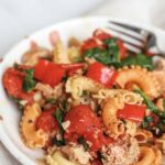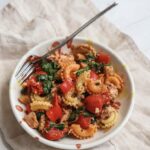 Once pasta is cooked, add it to the pan and combine. Next, add in the spinach and cook for another 2-3 mins until wilted.
